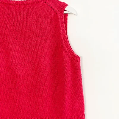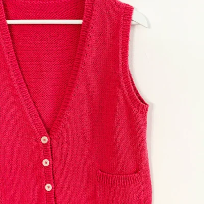 Descubre la magia de crear tu propio chaleco tejido en algodón 100%, una prenda versátil y elegante que combina con cualquier estilo. Este chaleco, trabajado a mano, luce un diseño de punto liso tanto en la parte delantera como en la trasera, aportando una textura ligera y un acabado impecable.
