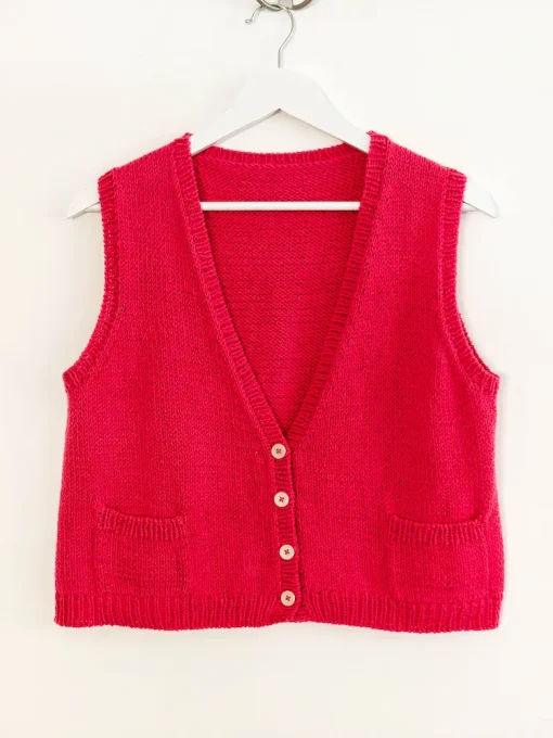 Descubre la magia de crear tu propio chaleco tejido en algodón 100%, una prenda versátil y elegante que combina con cualquier estilo. Este chaleco, trabajado a mano, luce un diseño de punto liso tanto en la parte delantera como en la trasera, aportando una textura ligera y un acabado impecable.