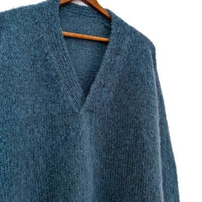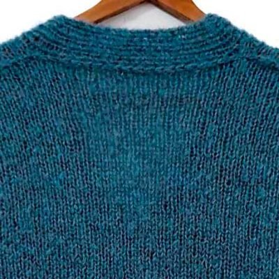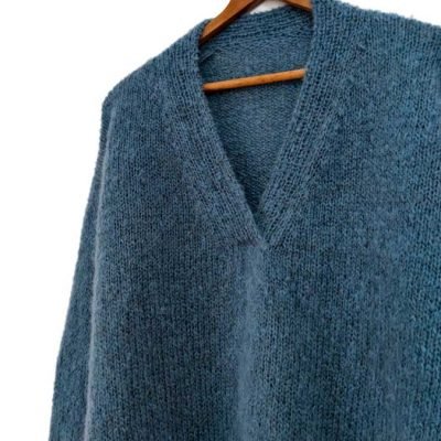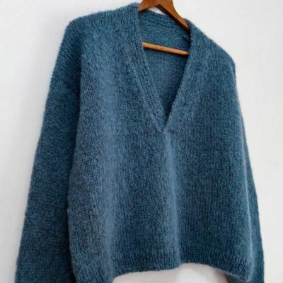 Se caracteriza por un hombro más bajo de lo habitual, lo que le da a la prenda un toque de informalidad. En este suéter, la línea de hombro caído se combina con unas mangas rectas para crear un look moderno y sofisticado. El escote en pico vertical, se teje al mismo tiempo que la prenda, es un escote clásico que nunca pasa de moda porque sienta espectacularmente bien.